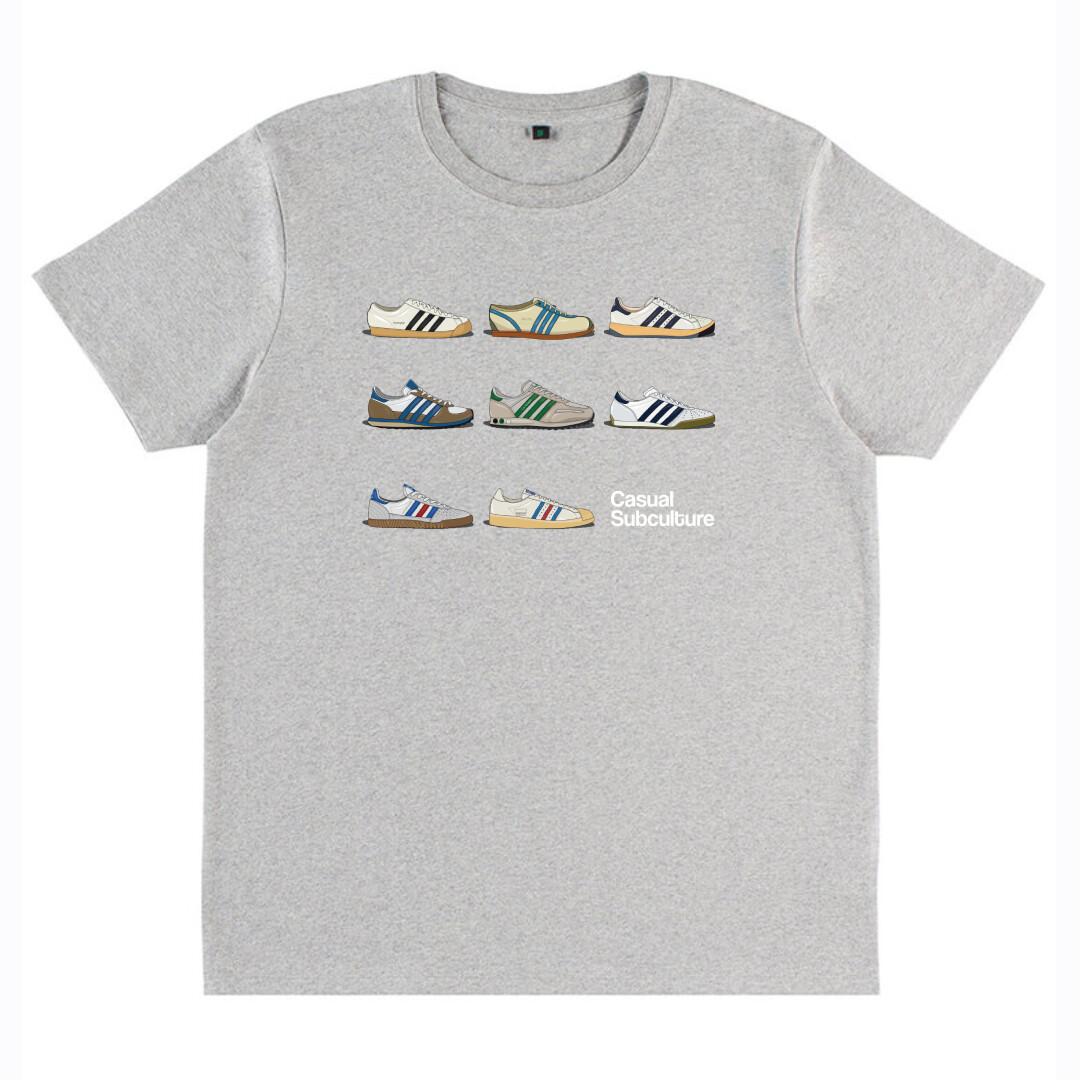 This design draws inspiration from some of our favourite vintage three stripe trainers including the Wimbledon, Indoor Super, Smash, LA Trainer, Grand Prix, Rom, Supergrip & the TRX Vintage, The design is printed on an organic ringspun cotton t-shirt using our high-quality direct-to-garment print system.